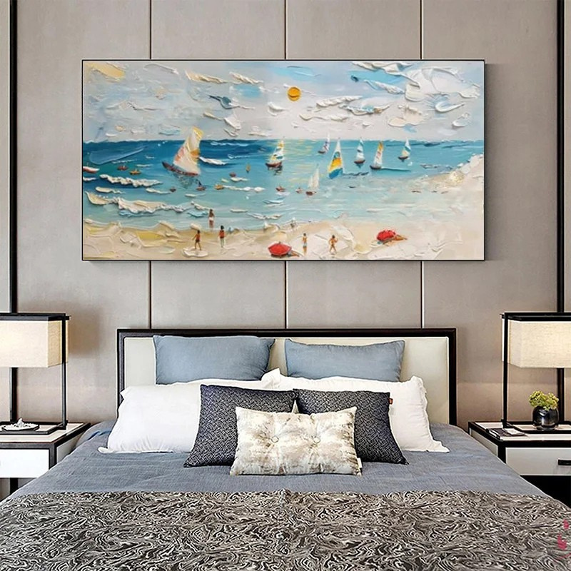 A bright, cheerful escape to the coast, Sail Day captures a textured summer scene of beachgoers and sailboats under a vivid blue sky. Thick palette strokes give the waves and clouds movement and light, making this painting feel alive with seaside energy. Ideal for bedrooms, breezy living rooms, or any space craving a sunny, tranquil vibe.